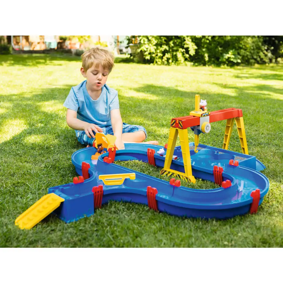 Hours of fun are guaranteed with the AquaPlay ContainerPort. Children from the age of 3 will love playing with the large port basin and adjustable freight crane, learning how to load and unload the transport boat and amphibious vehicle. And if the transport boat isn’t transporting its load to its destination quickly enough, the set also includes a crank handle with large blades to get the water moving. The mobile crane operates across the large port basin. Through play, children will learn how to operate the crane arm and use a turning wheel to move containers. By pushing the crane cab, children can move the container for unloading along the full length of the crane from one side to the other. The large AquaPlay ContainerPort set includes a canal system with port basin and access ramp, a large gantry crane, a crank handle to generate a current, a container boat with containers, an amphibious vehicle and the two play figures Bo the Bear and Wilma the Hippo. Together with their two friends, children can learn about water through play, discovering how currents are created, what makes water change direction, and how boats float. The set will also teach them how to coordinate simple processes such as the loading and unloading of containers and manually raising and lowering the crane arm. The AquaPlay ContainerPort playset is suitable for children aged three years and up. AquaPlay is made in Germany using high-quality UV-resistant plastic. The water ride set is easy to assemble. Perfectly designed seals can be fitted in a matter of seconds and guarantee there are no leaks. Each pack comes with easy-to-understand assembly instructions. All of the AquaPlay tracks can be combined with each other and with the extensive range of matching accessories to create your very own water world.