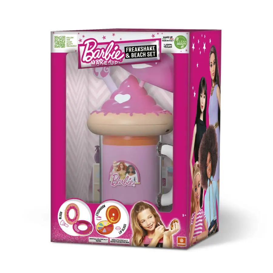 Barbies söta milkshake innehåller härliga sminköverraskningar! Dekorationerna visar sig vara sminkborstar, grädden är en spegel och munken avslöjar ögonskuggor. Innehåller även läppstift, rouge och läppglans. Åh, så underbart! 5+