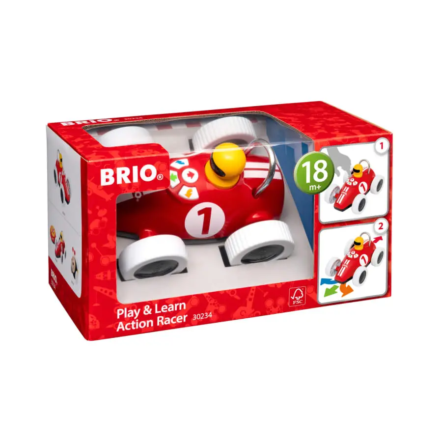 Start your engine because the 30234 Action Racer is at the line and ready to go. Press one of the four direction buttons on the car’s dashboard and then buckle up for a chase as it races off around the room. Based on the iconic BRIO Race Car design, this little racer is ideal for children aged 18 months and up and helps them to learn basic cause and effect through exciting play. This toy race car offers young children an early introduction to STEM learning. Play & learn with this speedy toy car as it follows your inputs and races around the room. Age-appropriate design with simple buttons for 1-year olds – go forward, left, right or reverse in 1 button press. Crafted using high-quality plastics and fine metal details. We know that children sometimes play with toys in other ways than expected. That’s why we test our products thoroughly with strict safety requirements which in many cases are tougher than the legal requirements.
