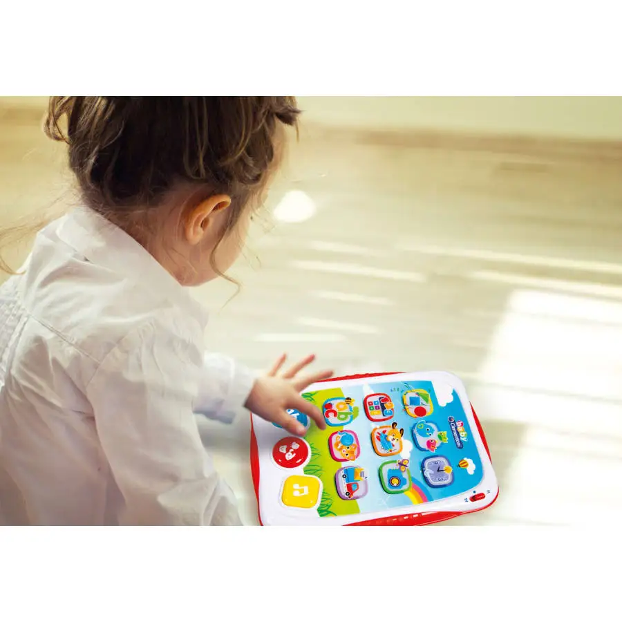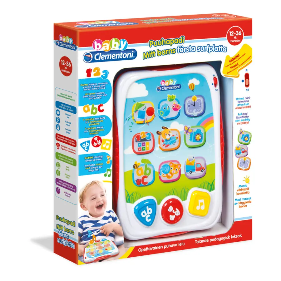 Denna färgglada surfplatta lär barnet bokstäver, siffror, former och färger. Den främjar även språk och pratförmåga samt händernas motorik. Produkten kräver 2 st AA-batterier, som medföljer i förpackningen. Rekommenderad ålder: från 1 år.