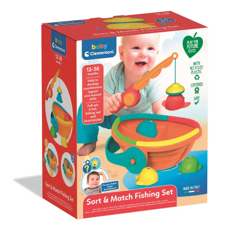 Ge dig ut på en fisketur! Fisken fastnar på fiskespöt med hjälp av en magnet och fångsten sorteras enligt färg. Utvecklar barnets koordinationsförmåga och färgigenkänning. Även lämplig som badleksak. Tillverkad av återvunnet material. 1+