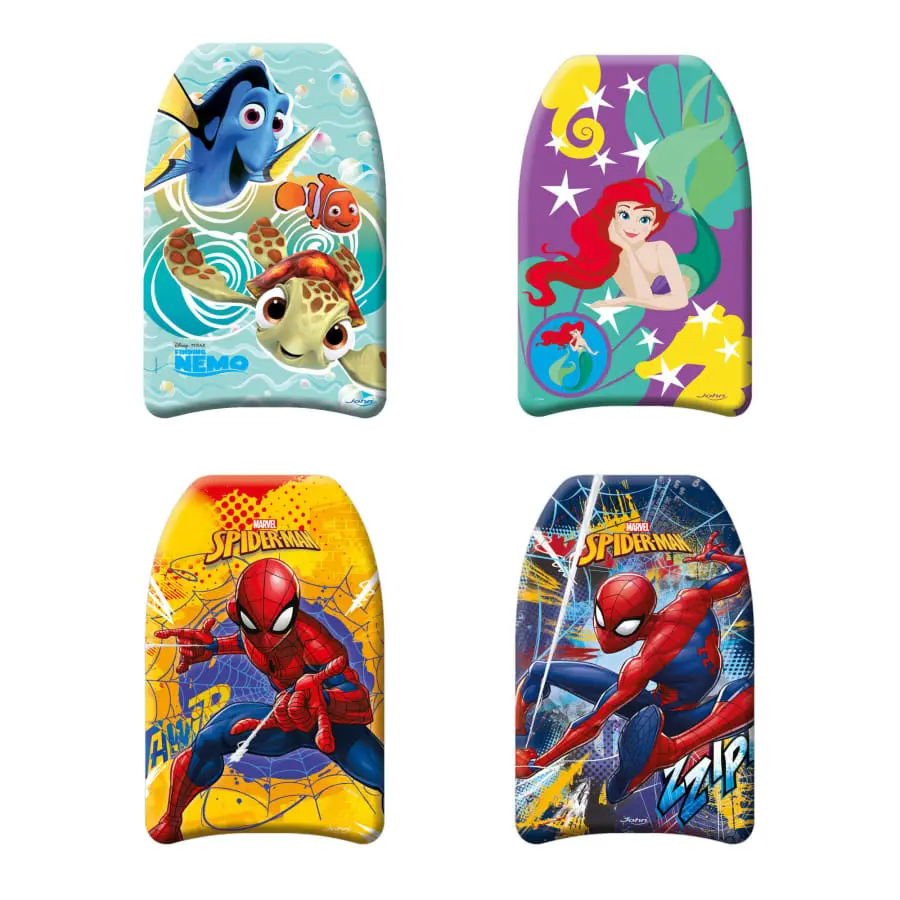 Dessa färgglada simbrädor pryds av antingen Disney prinsessor eller Spiderman. Greppa brädan och plaska iväg! Storlek: 43,5 x 28,5 x 3,5 cm. Flera olika. 3+. Displayn innehåller 6+6 simbrädor.