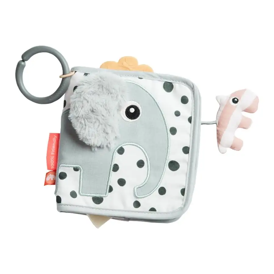 Fun and cute Elphee activity book filled with cool features. Inside the book a little mirror with gold details will smile back at your little one, a tiny teether attached to the pocket will be fun to touch and bite, and small fingers will make Ozzo do crinkle sounds.