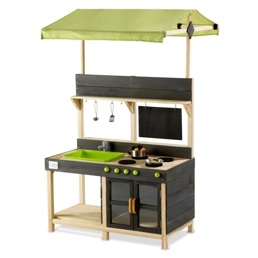 De EXIT Yummy 300 wooden outdoor kitchen is a multi-purpose play kitchen for children between the ages of 2-5. It has all the kitchen essentials and the green roof and chalkboard make this a unique kitchen. With the included kitchen accessories such as pans, kitchen utensils and food, the the EXIT Yummy outdoor kitchen really comes alive!
