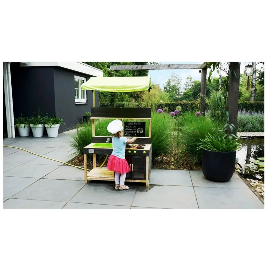 De EXIT Yummy 300 utekök i trä är ett mångsidigt lekkök för barn mellan 2-5 år. Den har alla nödvändiga kökssaker och det gröna taket och svarta tavlan gör detta till ett unikt kök. Med de medföljande kökstillbehören som kokkärl, köksredskap och mat kommer EXIT Yummy uteköket verkligen att leva!
