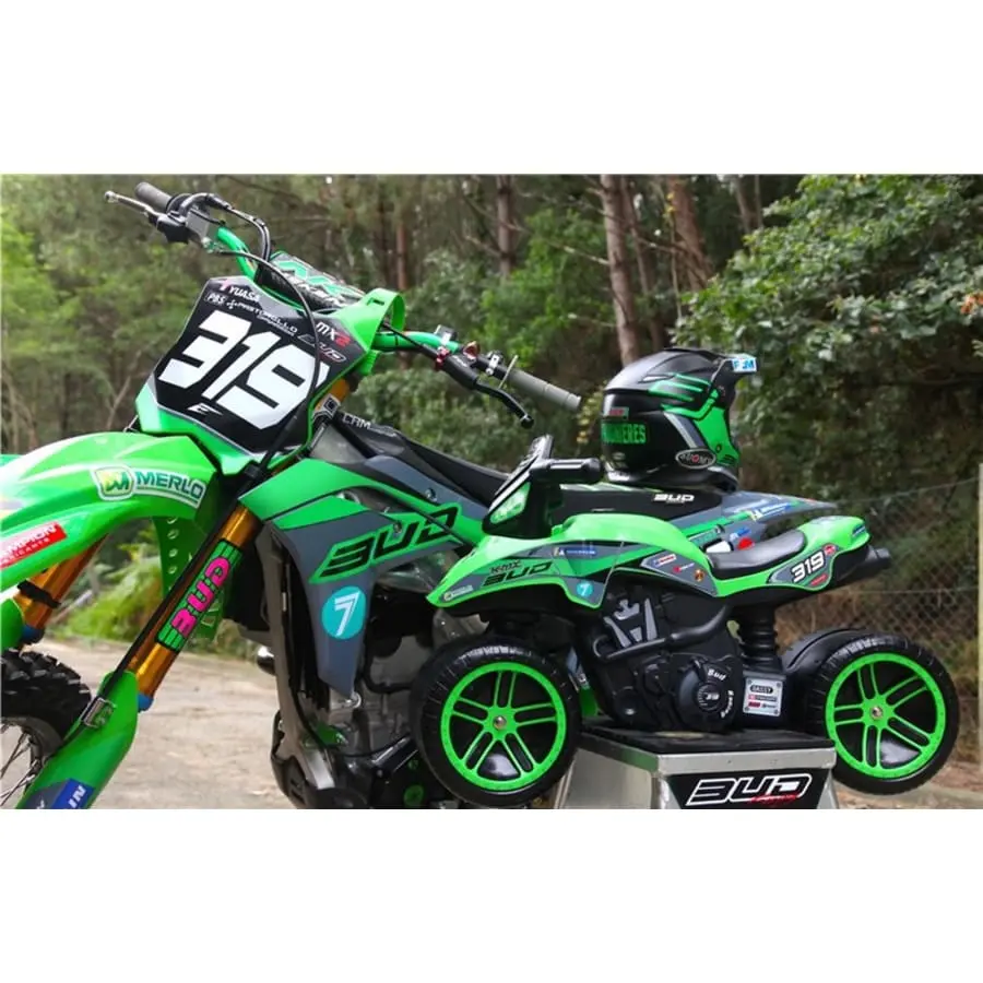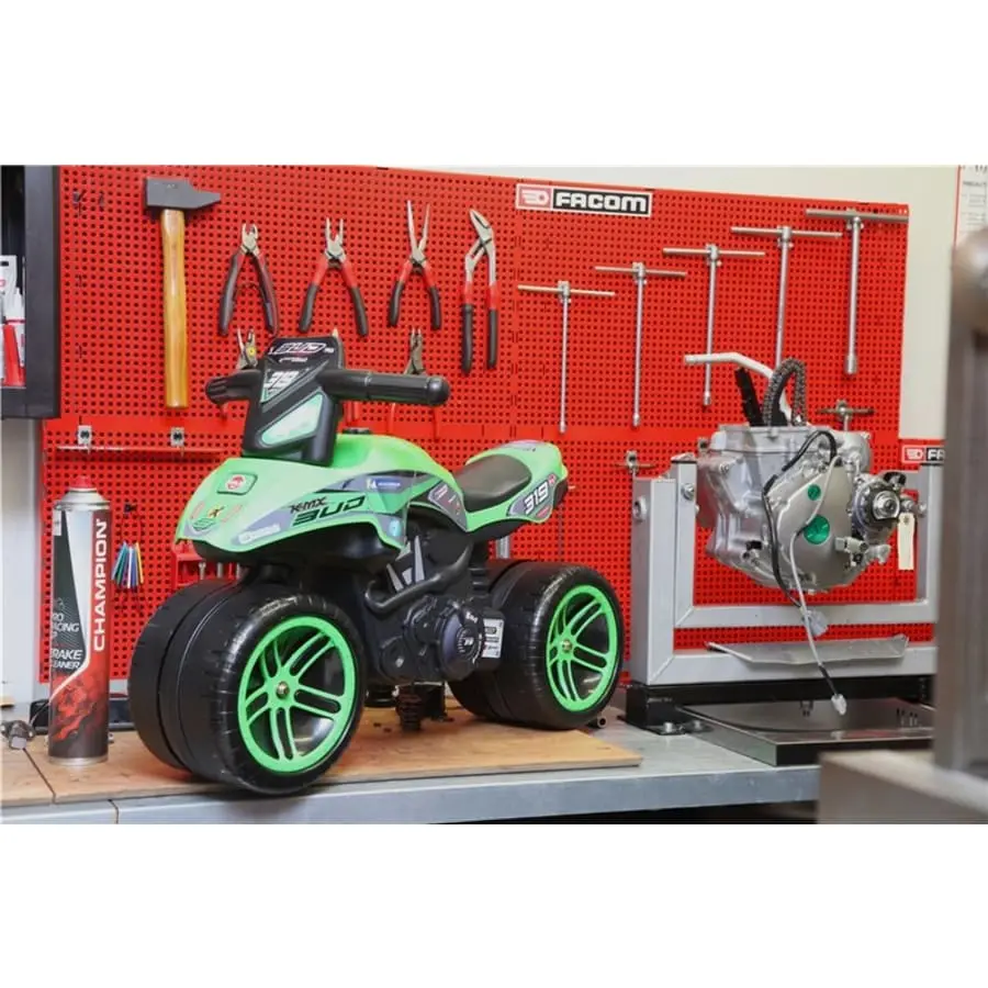 3 … 2 … 1! Are you ready to see your little speedster on a Baby Carrier motorcycle in the colors of the famous Kawasaki Bud Racing Motorcycle Cross Team? A fine replica of the Quentin Prugnières Grand Prix motorcycle. It is made entirely in France and designed especially for children aged 2-5. Its wide wheels provide the necessary stability and safety while developing the child’s balance and motor skills. Thanks to the rotating handlebar, it is easy to control. No more excuses not to take this little motorcycle with you every time your child is on the move – thanks to its light weight, it’s easy to transport.