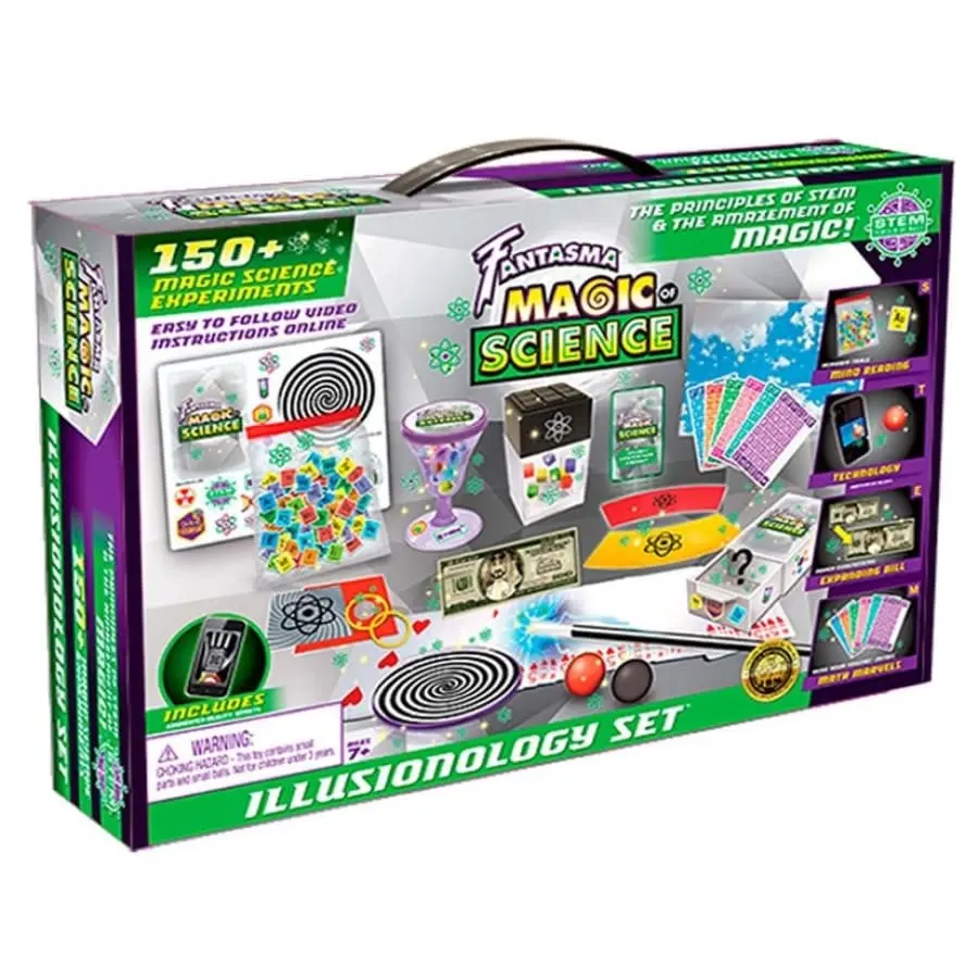 Fantasma’s Magic of Science, Illusionology STEM Magic Set has more than 150 science experiments that amaze like magic and support national core curriculum STEM learning! Comes complete with our Secrets of Science manual and links for easy to follow video instructions. Explore the amazing effects of refraction, magnetism, simple engineering, augmented reality & more in this one of kind science explained magic set.