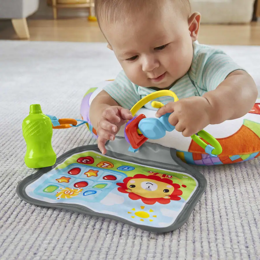 This comfy and supportive videogame-themed wedge encourages baby’s gross motor development. The bright-coloured crinkling screen with a picture of a smiley lion and two detachable rattles make tummy time more fun! 0 mos+