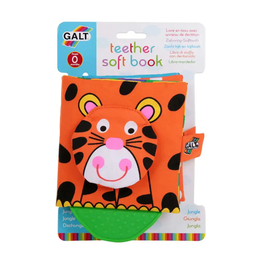 Soft book with pictures of jungle animals. The pages are crumbling and have fun details. There is a chew toy at the bottom of the book.