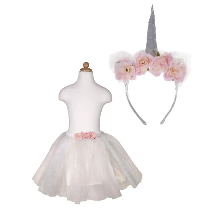 Mysig ljus drömtutu i tyll och enhörningspannband med rosendekorationer.