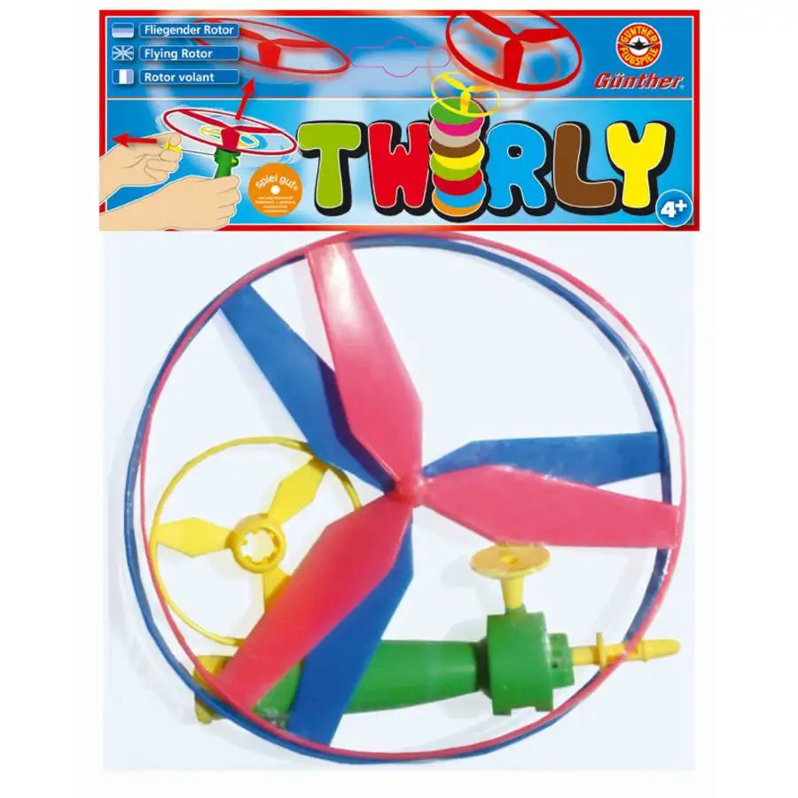 The Günther Twirly rotor toy has a pull starter and two free-flying rotors