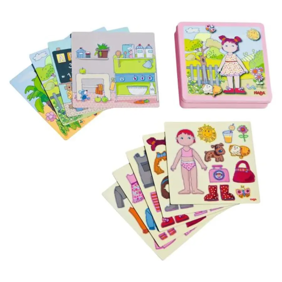 En rolig magnetisk komposition, med vilken barnet kan designa flera olika outfits och frisyrer till Lilli. I paketet ingår ytterligare tillbehör och olika temamiljöer där Lilli kan kläs efter önskemål. Komposition utvecklar barnets kreativitet och fantasi. Paketet innehåller en metallförvaringslåda, fyra bakgrundsbrickor och 54 magnetiska delar. Paketstorlek: 21x3x21 cm. Åldersrekommendation: 3+.