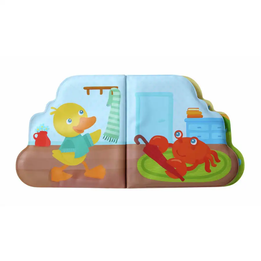 Colorful illustrations inspire you to read this book. Inside the book is a squeaky toy. Size 14×14 cm. Soft EVA plastic. Age recommendation: 1.5+.