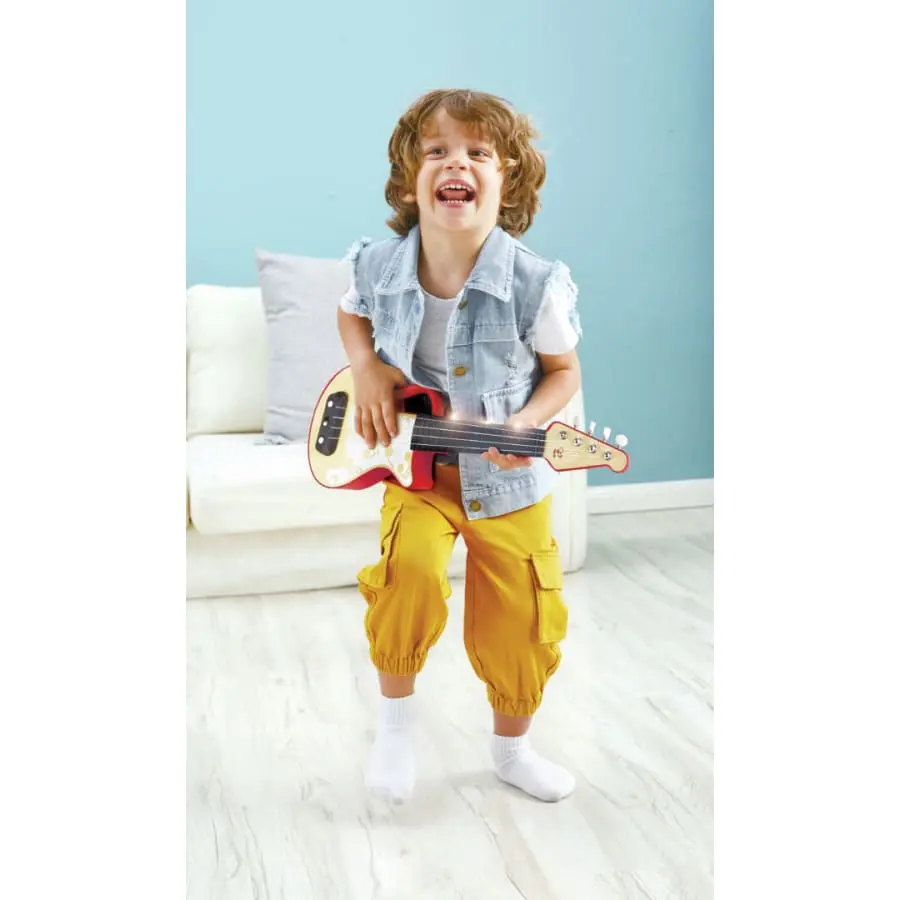 Ett läroinstrument som ser ut som en elgitarr med blinkande ljus. Du kan spela gitarr enligt lamporna som blinkar i takt med musiken. Fem olika låtar, som du kan välja enklare bland, eller när du redan vet hur du spelar bättre, kan du välja ett alternativ där musiken får fart och andra instrument hörs, som du kan spela tillsammans med. Gitarren har ett praktiskt handtag som gör den lätt att bära runt på. Tillverkad av trä, tack vare vilket ljuden låter bättre. Inkluderar 3x AAA-batterier. Åldersrekommendation: 3+.