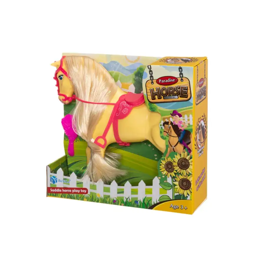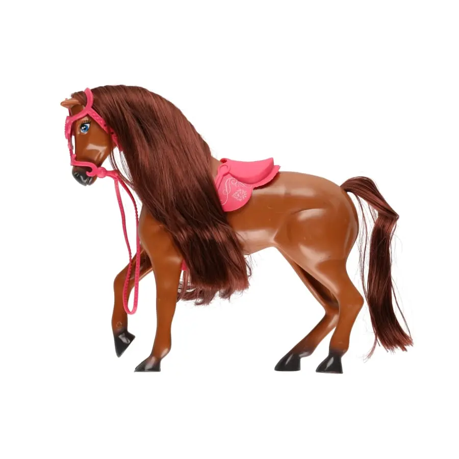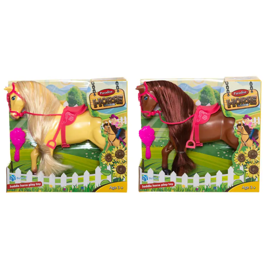 Horse with long mane and tail. Comb included. Removable bridle and saddle.