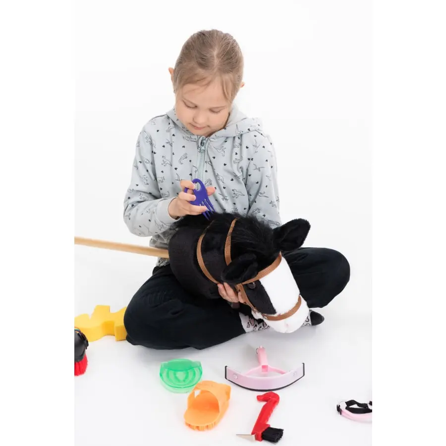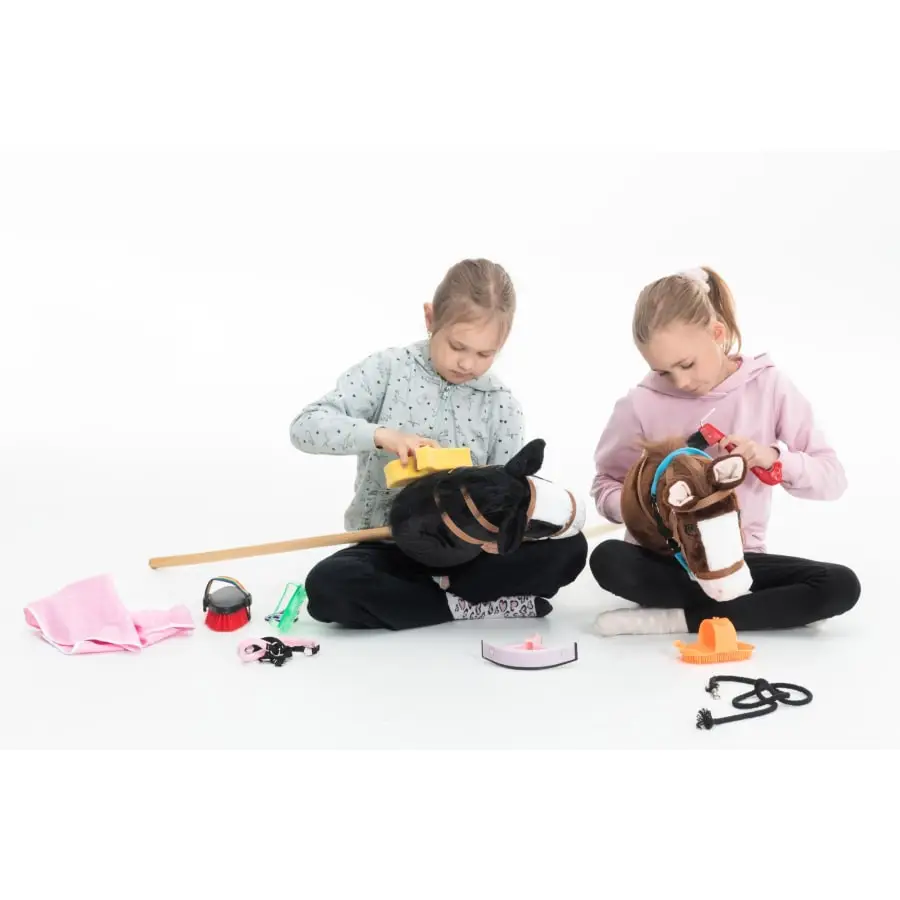 Hobby horse with big plush head. Bridles without bit. Hobby horses attract for versatile and athletic games.