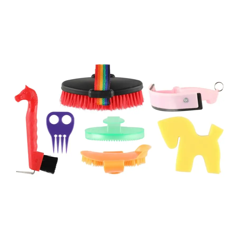 Set includes brushes and accessories needed to take care of your horse. 7 pcs in total.