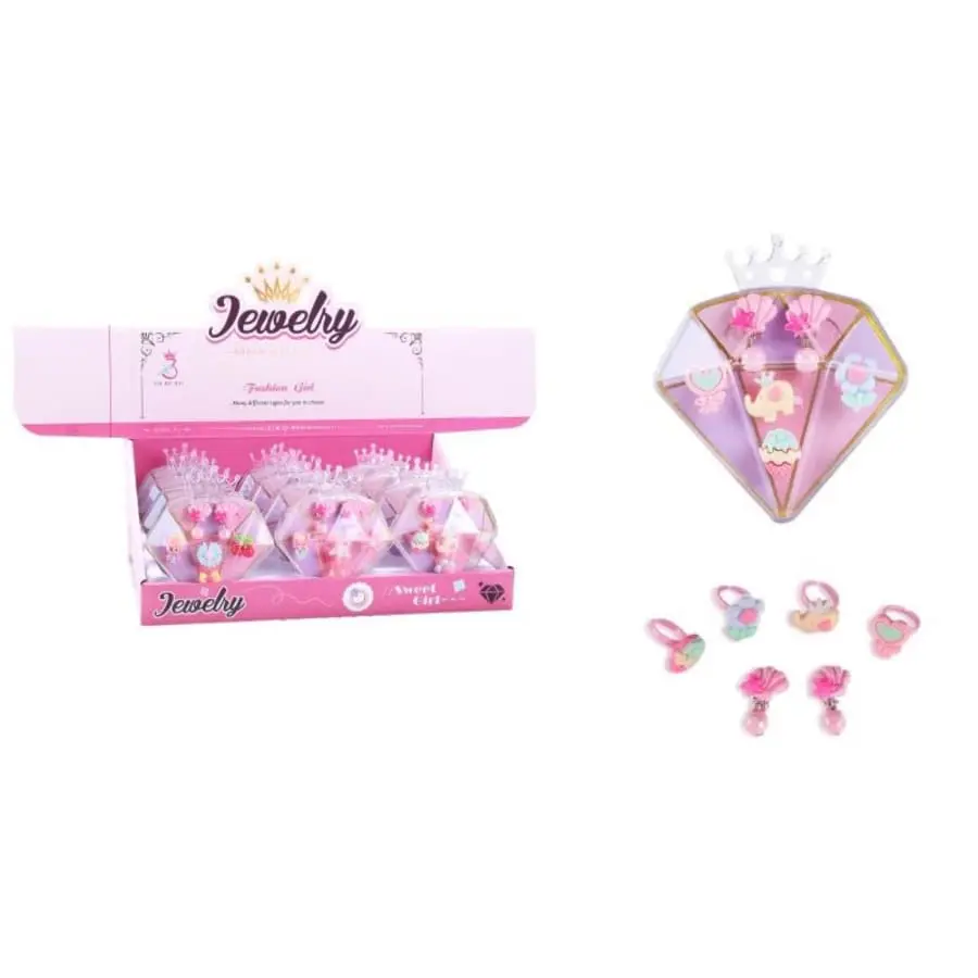 Beautiful jewelry in soft pastel shades. The diamond-shaped box contains four rings and one pair of earrings. The earrings have a sturdy metal clip to keep the earring firmly in place.