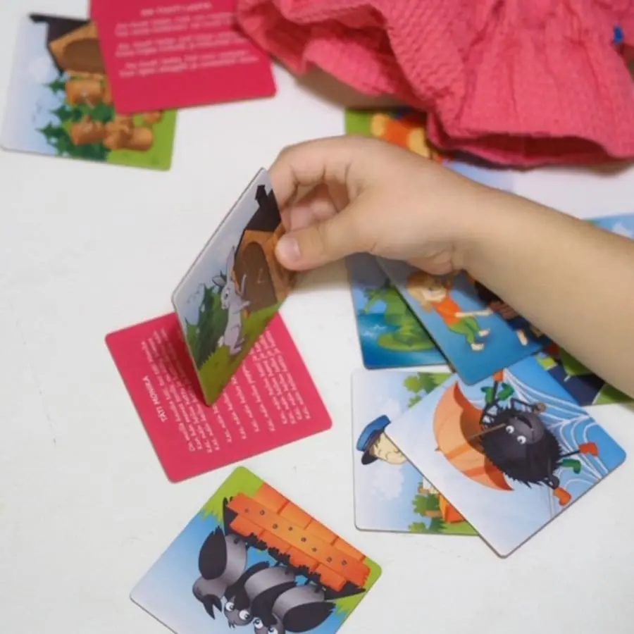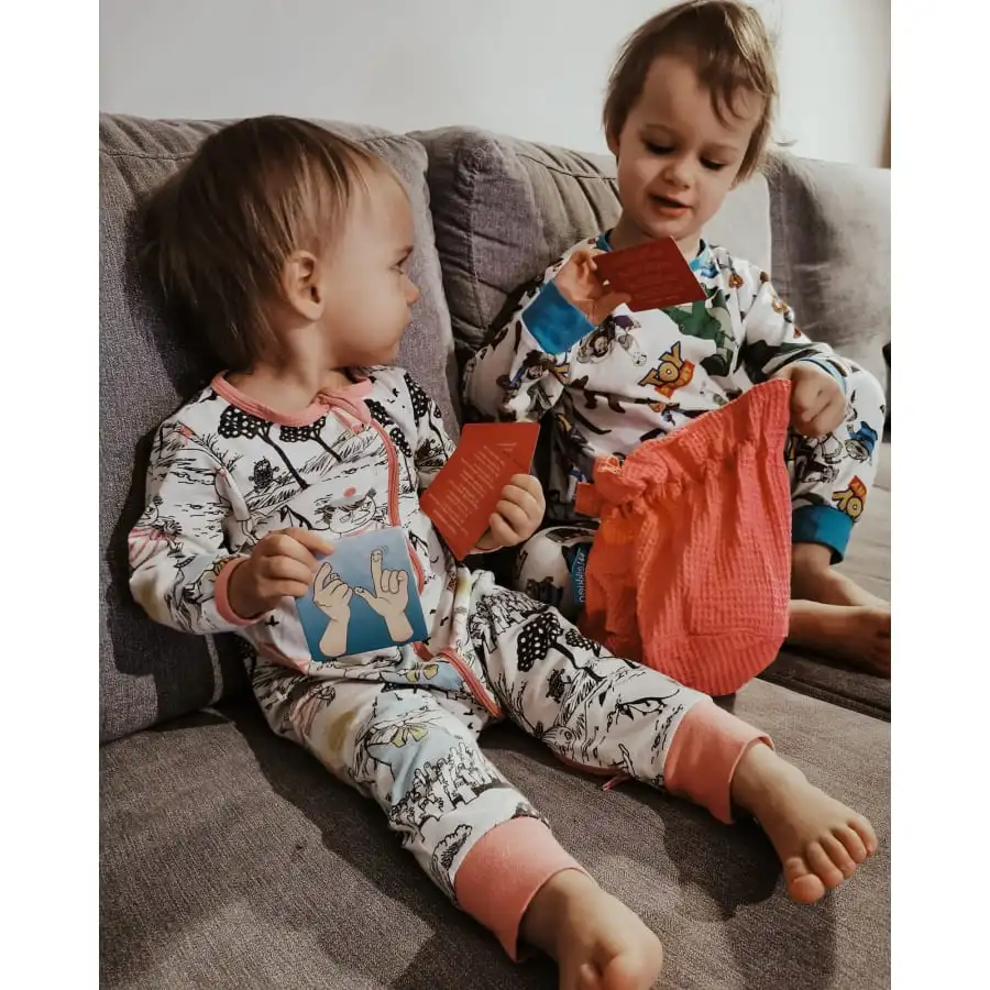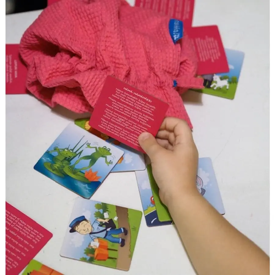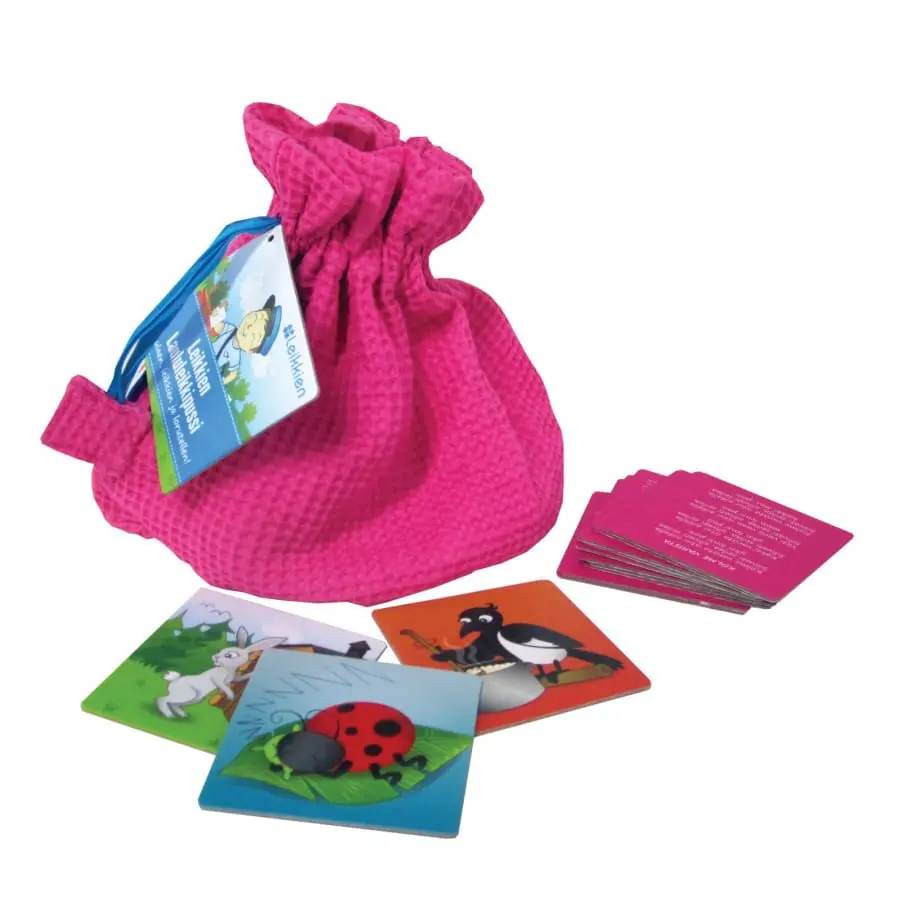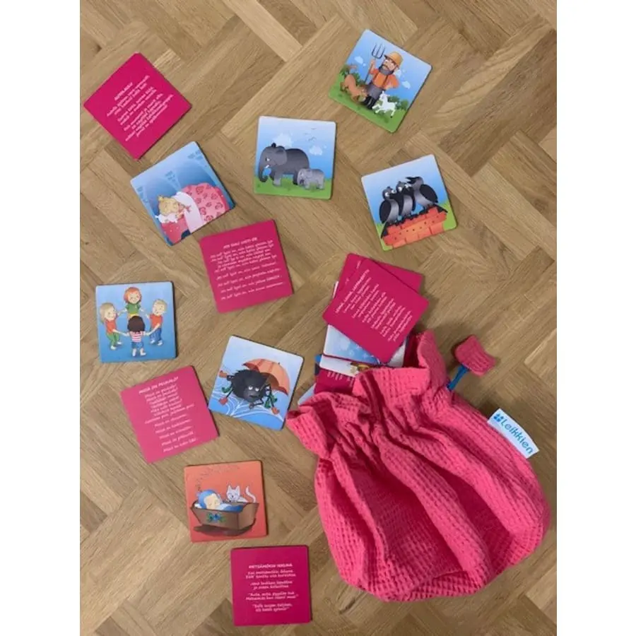 Who gets, who gets to peek into the bag of rhymes? Leikiken Laululeikkipussi contains 24 traditional children’s songs. On one side of the rhyme card are the words of the song and on the other, a funny picture that matches the theme. Rhyming can strengthen the development of a child’s linguistic skills, and a joint moment of rhyming can support the interaction between a child and an adult. With the song play bag, the child can get to know traditional children’s songs.