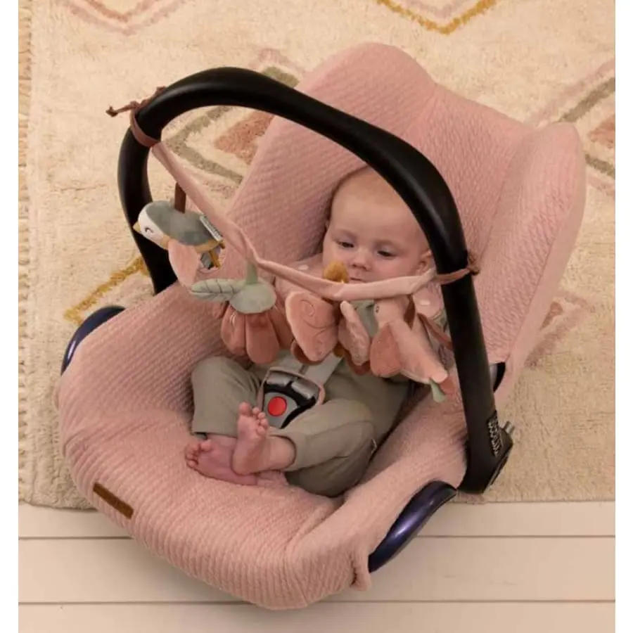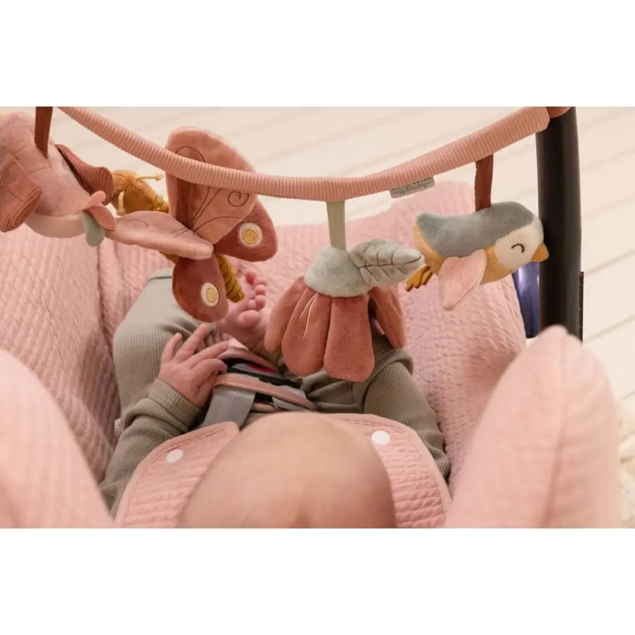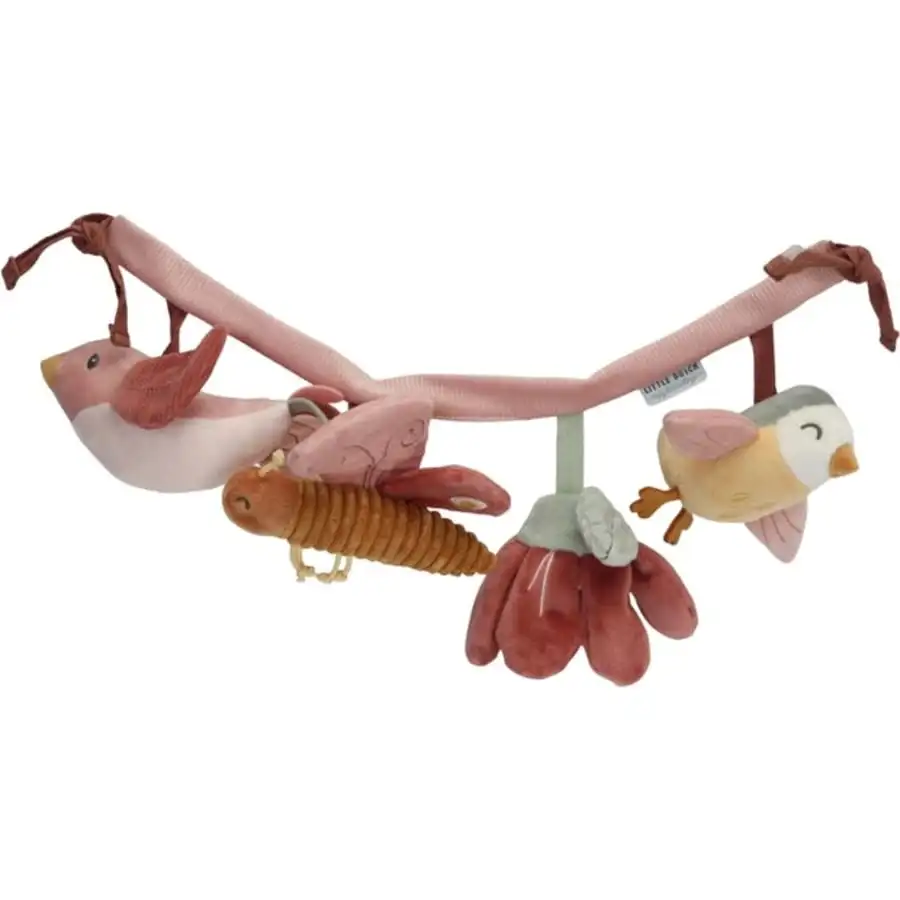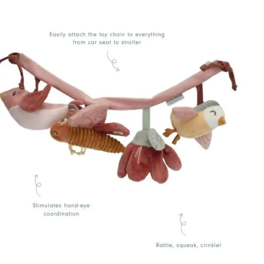 A cute cotton wool rattle with four cuddly figures. A rattling bird, a croaking butterfly and a cuddly flower and a squeaking bird.