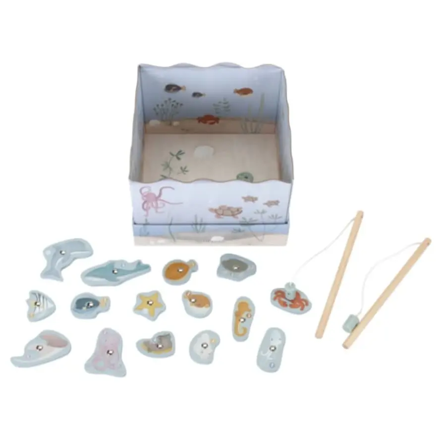 • 14 sea animal figures, 1 boot, 2 fishing rods, cardboard aquarium.