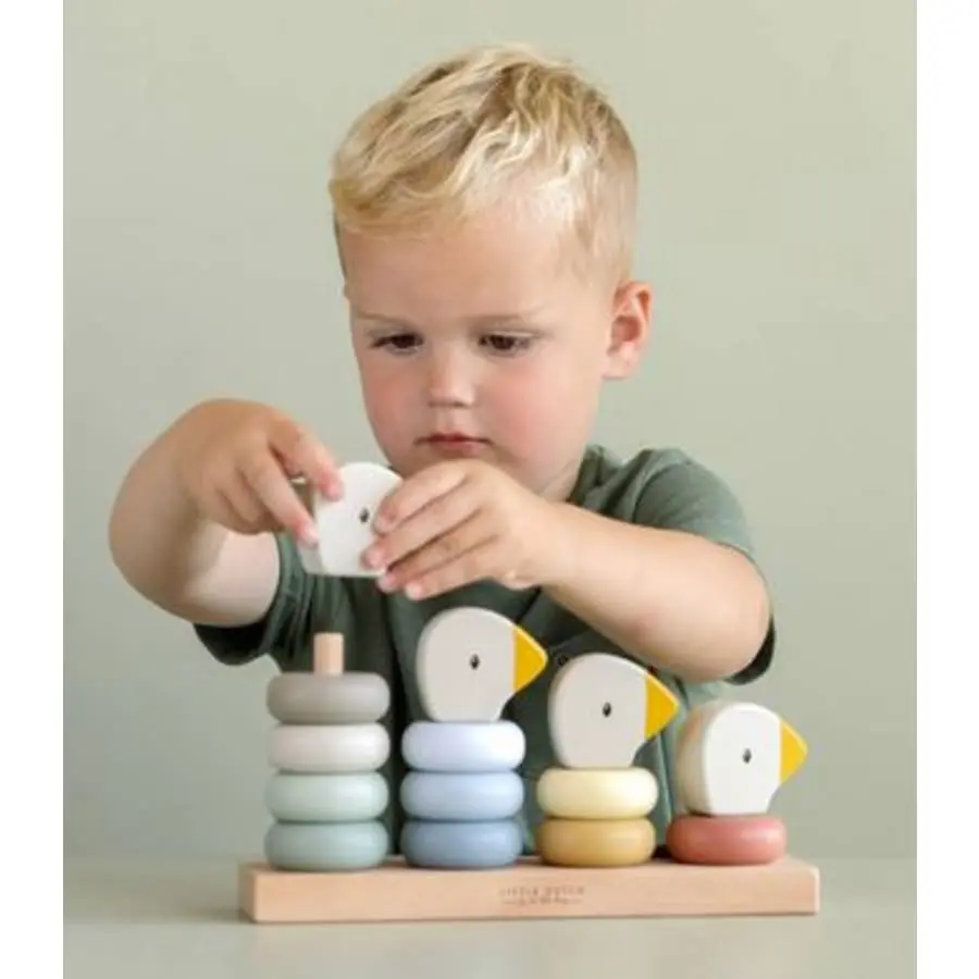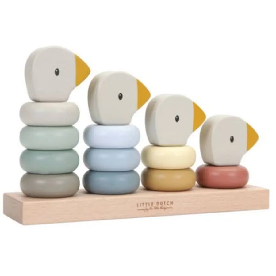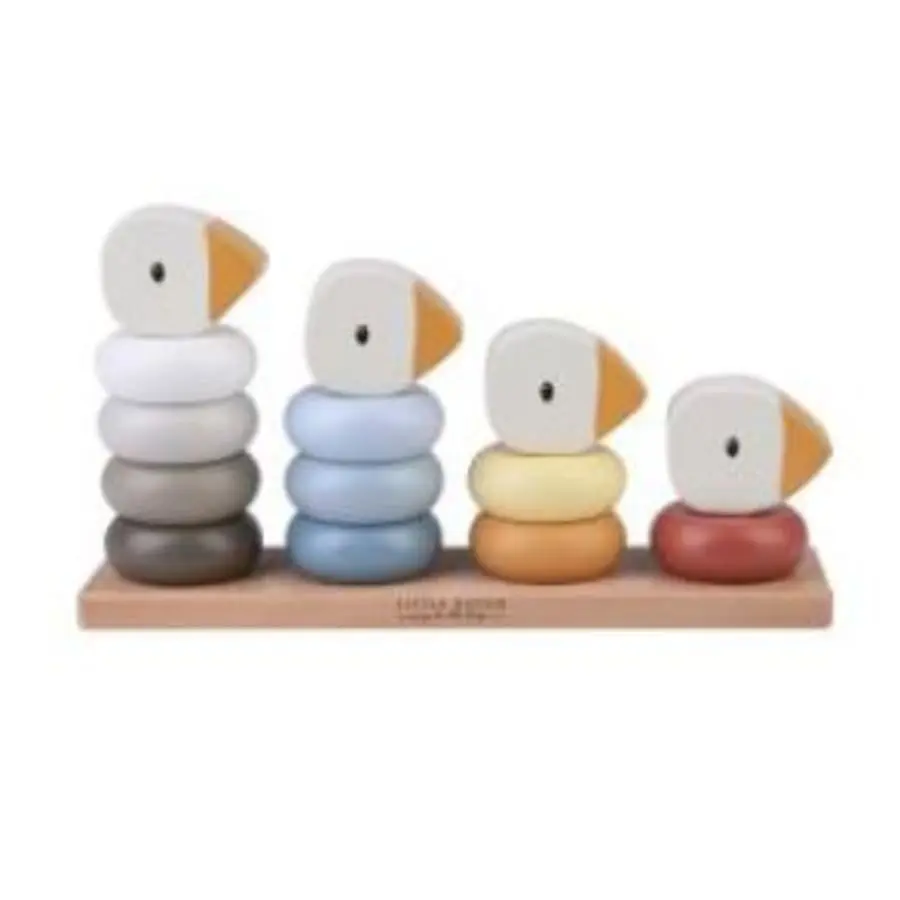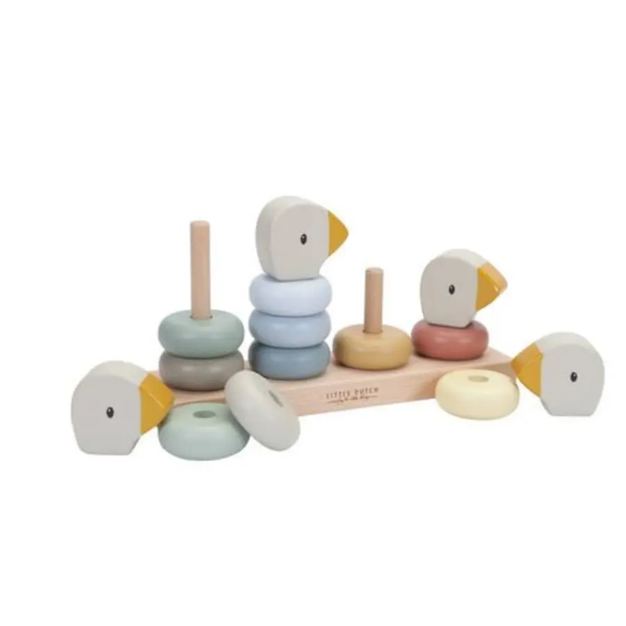 The 14-part wooden Little Goose family ring game helps the child learn and count from one to ten and develop hand-eye coordination.