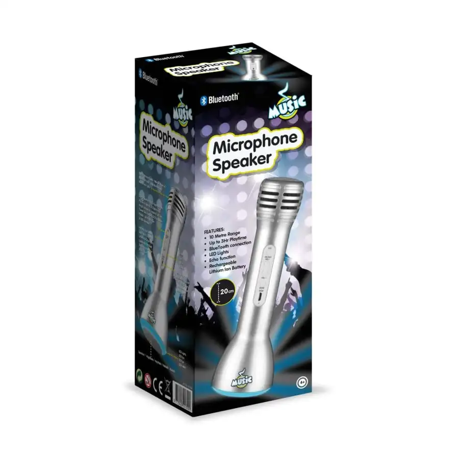 Scenen är din! Nu kan du hålla den stora musikkonserten själv med den här mikrofonen. Mikrofonen kan användas inom ett område på upp till 10 meter, och den håller i upp till 3 timmar per laddning. Den har inbyggd eko-effekt, som gör att dina låtar blir ännu roligare att lyssna till. Du kan koppla in din egen musikspelare via Bluetooth eller SD-kort, så du kan sjunga med till alla dina favoritlåtar. LED-ljusen hjälper till med att skapa en riktig fest stämning. Ladda upp mikrofonen via USB-kontakten.