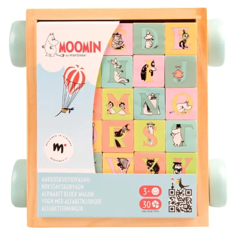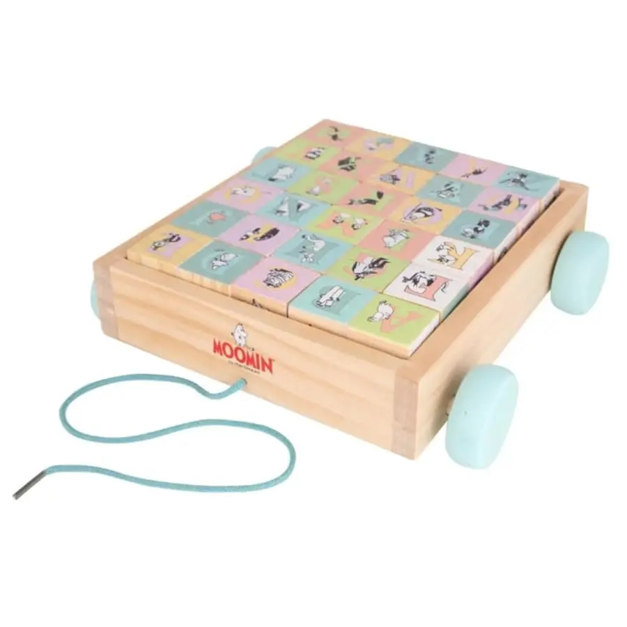 Hurmaavassa setissä on matala puinen vaunu, jossa on pastellinvihreät pyörät sekä vetonaru. Setin 30 palikkaa saa asetettua vaunun kyytiin, tai vaunuun voi laittaa kyytiin mitä tahansa muitakin leluja: vain mielikuvitus on rajana! Palikoilla leikkiessä lapsi oppii kuin huomaamattaan kirjaimia, numeroita ja muita merkkejä. Iloisiin, muumimaisiin hetkiin ja leikkeihin!
