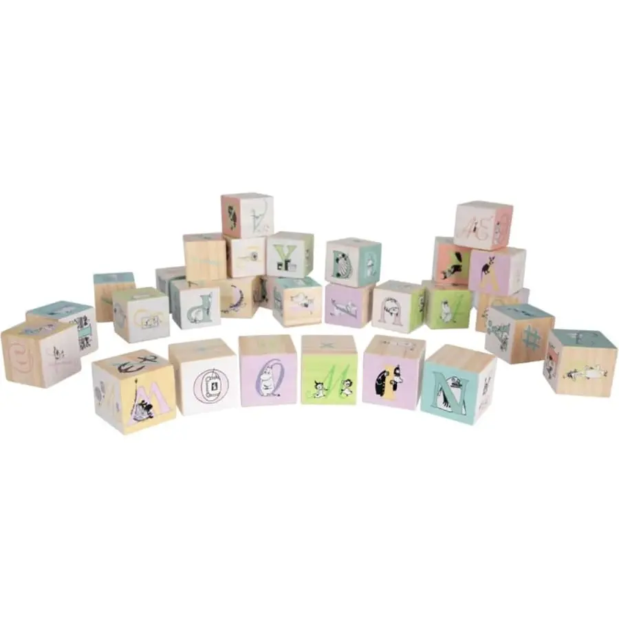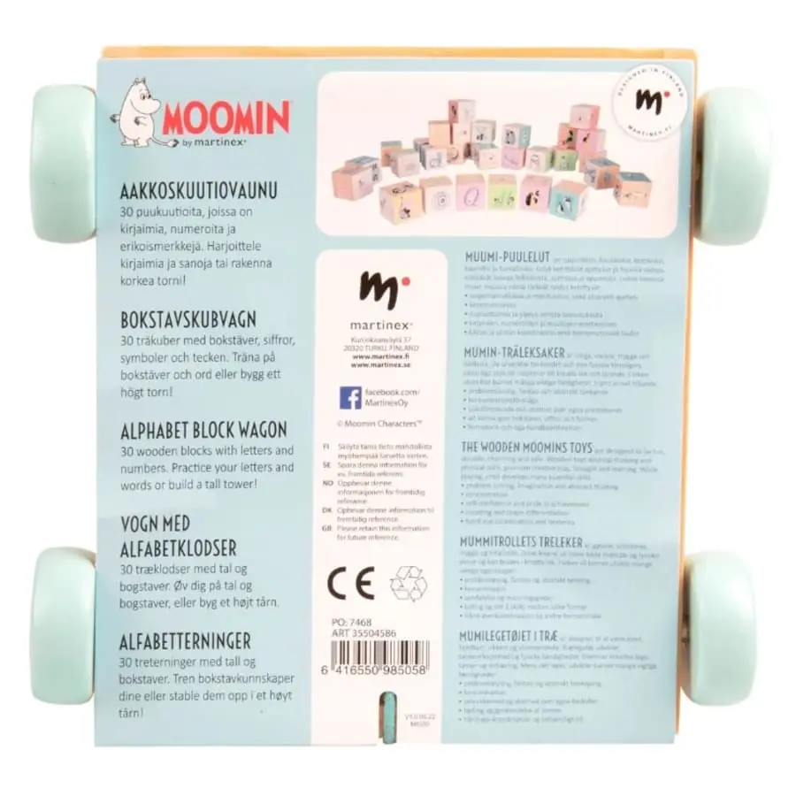 En fin träleksak med Mumin! En låg vagn i trä, med pastellgröna hjul och dragsnöre. Vagnen är fylld av pastellfärgade träkuber med alfabetets alla bokstäver (å, ä, ö ingår), siffror och tecken, tillsammans med Muminfigurer som klättrar, kryper och busar med bokstäverna. Innehåller 30 kuber (danskt, norskt ø ingår). Träna bokstäver eller bygg ett högt torn! 3+