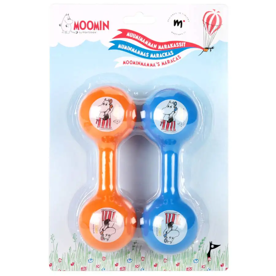 2 st dubbla marackas i orange och blått med tryck av Muminmamma. Se också andra instrument från Mumin.