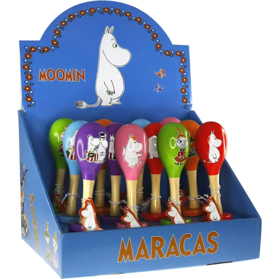 - Lajitelmassa värikkäät Muumi-aiheiset marakassit.