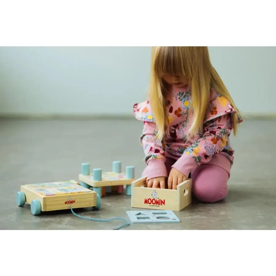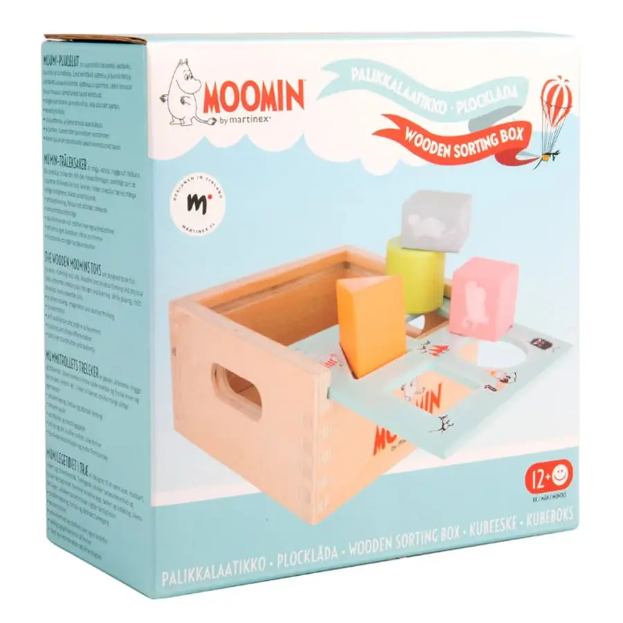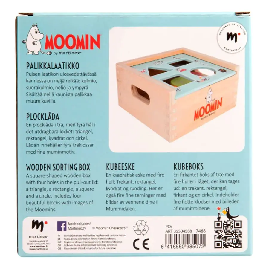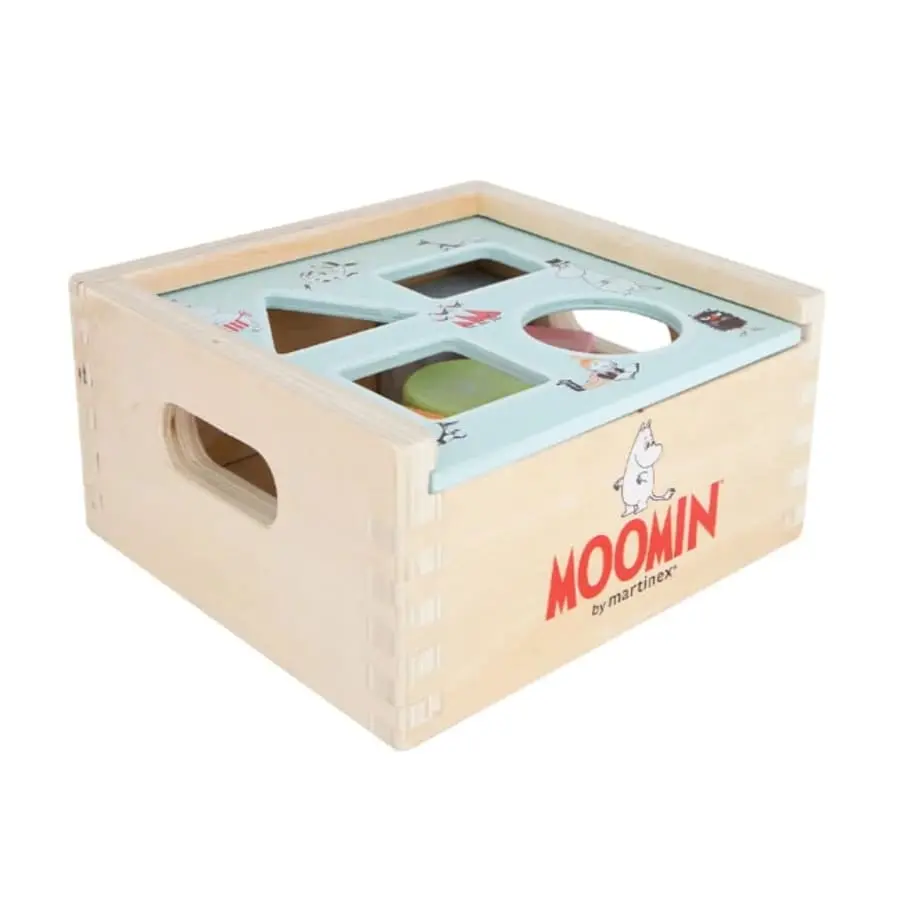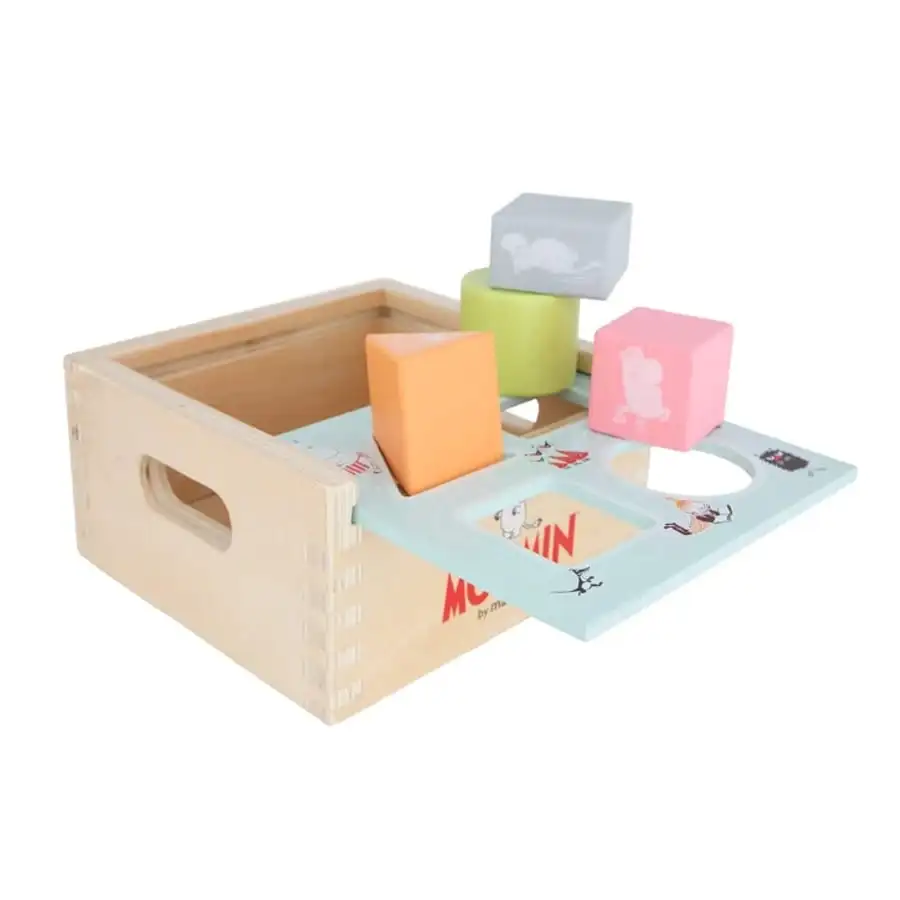 Klassisk träleksak med Mumin! En fyrkantig, låg plocklåda (bredd 15 cm) med fyra hål i det utdragbara locket: triangel, rektangel, kvadrat och cirkel. De fyra träklossarna är pastellfärgade och dekorerade med små Muminfigurer. 1 år+