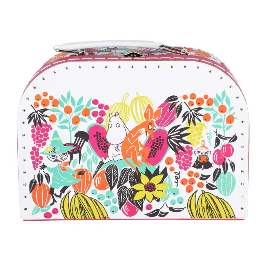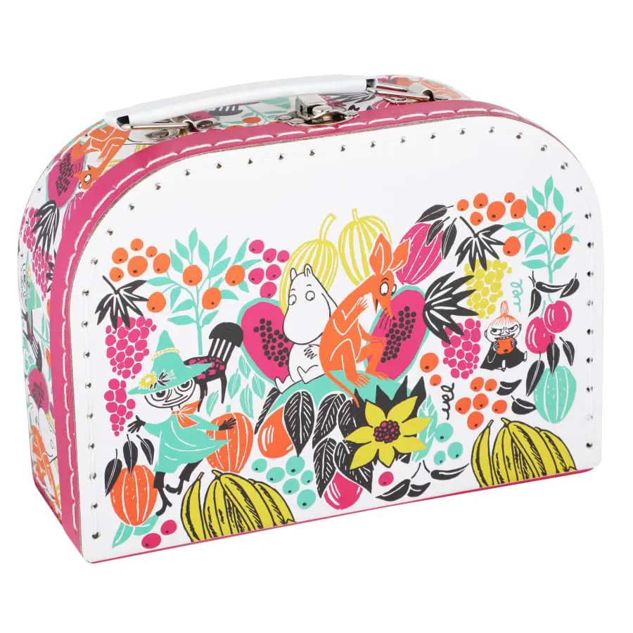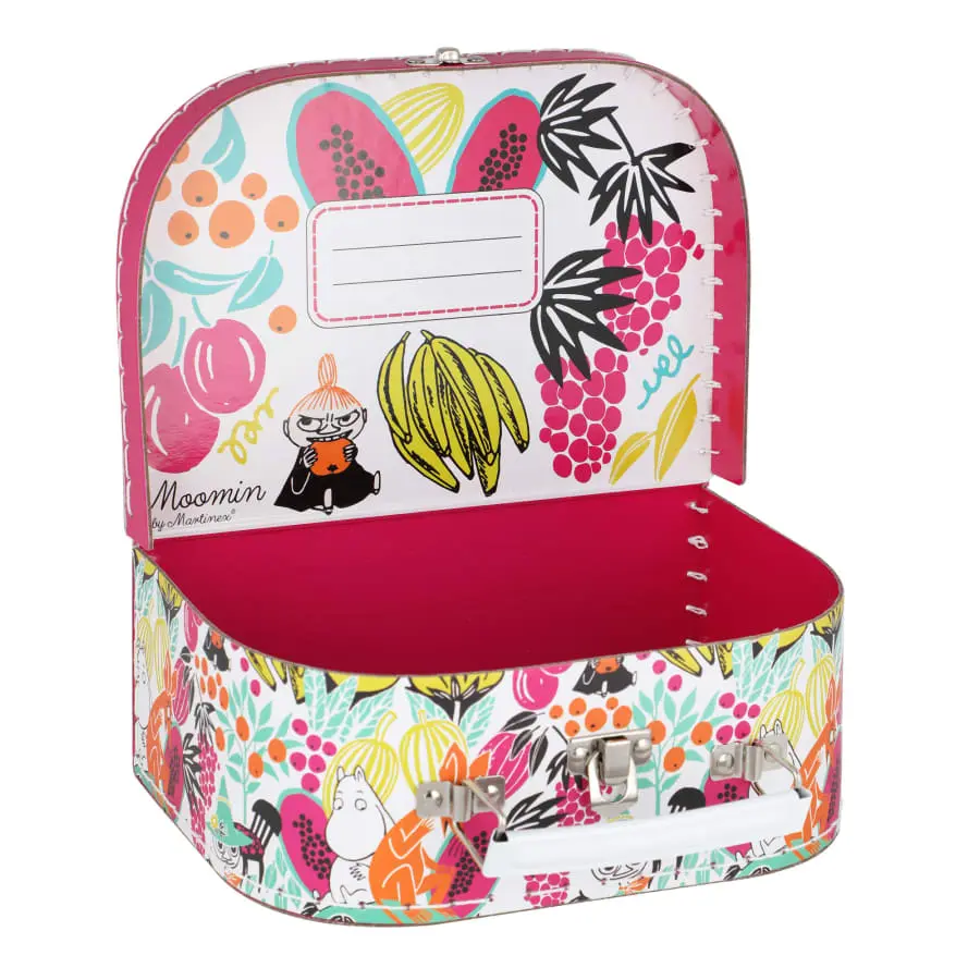 En liten pappväska att packa leksaker och andra små skatter i. Väskan är vit och fuchsia-rosa och helmönstrad med Muminfigurer bland färgglada frukter. Upptill har den ett bärhandtag och ett lås i metall. Insidan är fuchsia-rosa, med Lilla My bland frukterna på insidan av locket, där det även finns en namnetikett. 0+