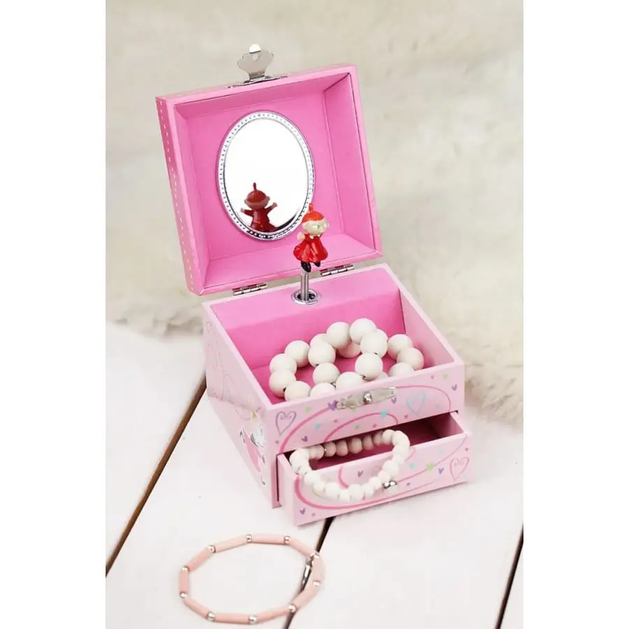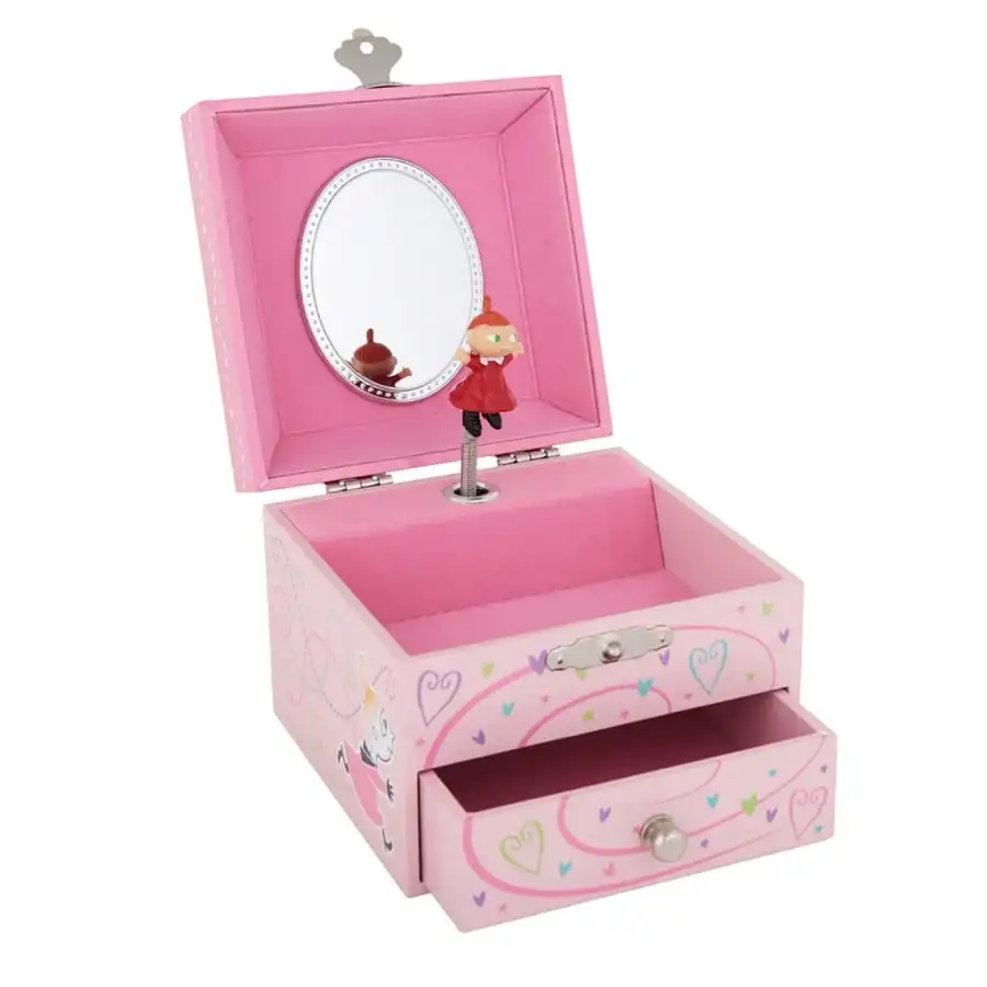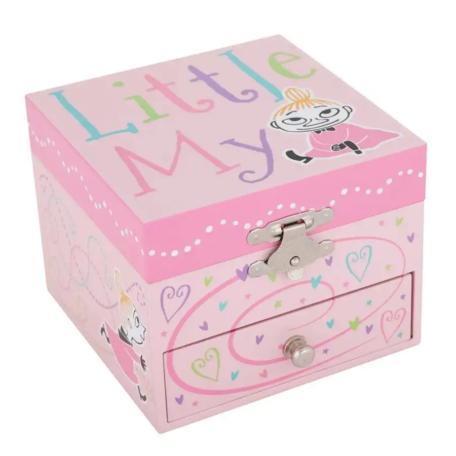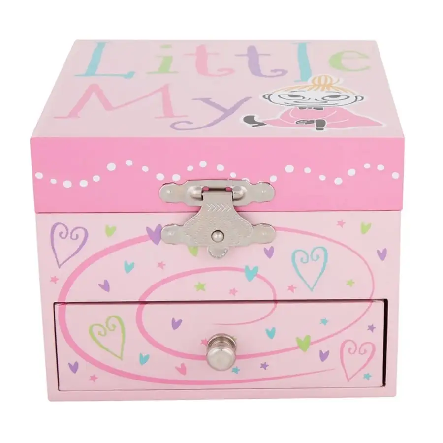 Smyckeskrin och speldosa med en dansande Lilla My, framför den lilla spegeln i locket. Nedtill finns det en utdragbar låda och baktill ett vred, som man vrider upp speldosan med. När man öppnar locket börjar musiken spela. 3+