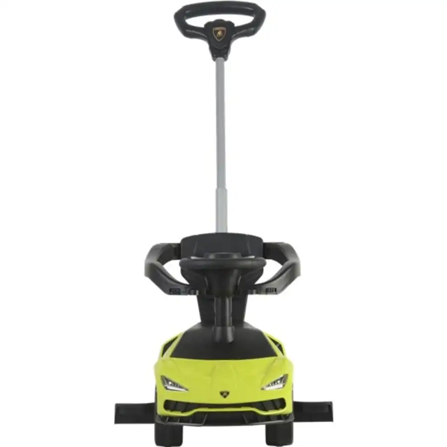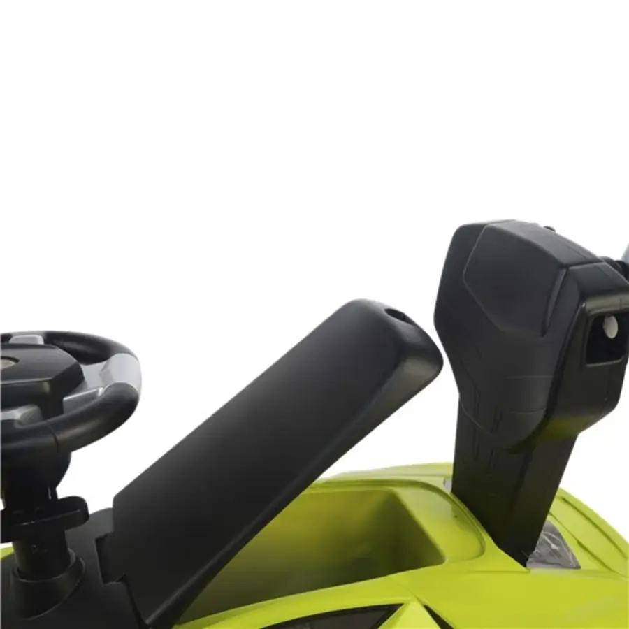 This NORDIC PLAY kicker, produced under license from Lamborghini, is a children’s version of the Lamborghini Centenario. The color of the car is trendy green. The equipment includes a push bar, backrest, footrest and removable guardrails. The horn and music functions are controlled by the steering wheel buttons (requires 2 x 1.5V AA batteries, not included in the package).