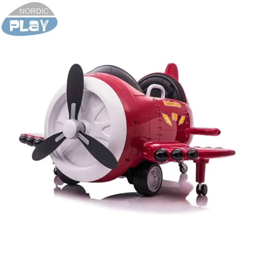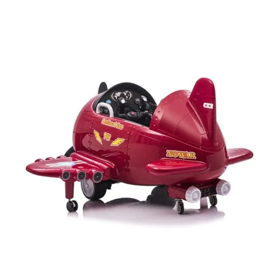 Planet har en mycket realistisk vindruta och en propeller (som ska installeras). Propellern roterar medan maskinen är igång. Planet kan även styras av en vuxen med den medföljande fjärrkontrollen. Planet finns även i rött eller blått. Instrumentbrädan har 8 LED-lampor och olika ljud, såsom: start, maskingevärsljud och bombljud. Du känner att du befinner dig i ett hagel av kulor. Du kan också lyssna på musik genom att ansluta MP3:n till USB-porten. När ditt barn har ”flygit klart” kan vingarna enkelt vikas ihop och tar därmed lite förvaringsutrymme.