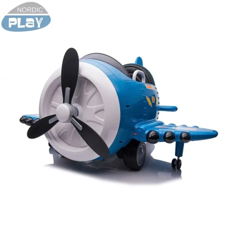 Planet har en mycket realistisk vindruta och en propeller (som ska installeras). Propellern roterar medan maskinen är igång. Planet kan även styras av en vuxen med den medföljande fjärrkontrollen. Planet finns även i rött eller blått. Instrumentbrädan har 8 LED-lampor och olika ljud, såsom: start, maskingevärsljud och bombljud. Du känner att du befinner dig i ett hagel av kulor. Du kan också lyssna på musik genom att ansluta MP3:n till USB-porten. När ditt barn har ”flygit klart” kan vingarna enkelt vikas ihop och tar därmed lite förvaringsutrymme.
