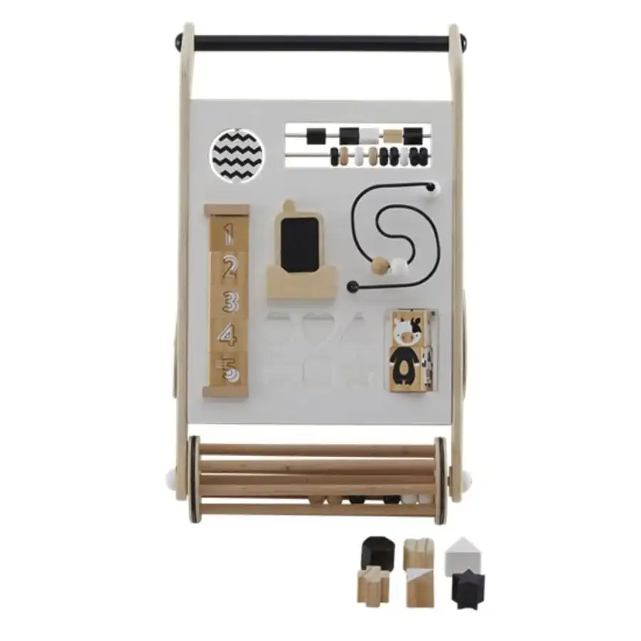 Vahvista lapsesi motorisia taitoja ja luovuutta tämän upean aktiviteettivaunun avulla. Vaunussa on massiivipuiset pyörät, kumireunat. Siinä on geometrisia palikoita, pallokehys, puinen puhelin, peili, numero/ symboli kääntökappaleet, kaksi puupalikkaa, joista saa eri eläinyhdistelmiä, kiemurainen rata puupalloille, joka kehittää lapsen koordinaatiotaitoja jne. Lyhyesti sanottuna se on täynnä toimintaa, joka kehittää lapsen aisteja, luovuutta ja motorisia taidoja.