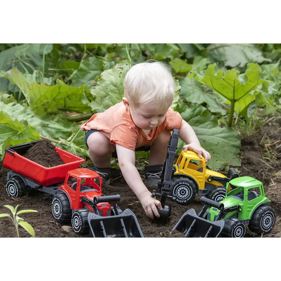 Den praktiska och tåliga Plasto-nyhetstraktorn med främre skopa och släp är 56,5 cm stor.