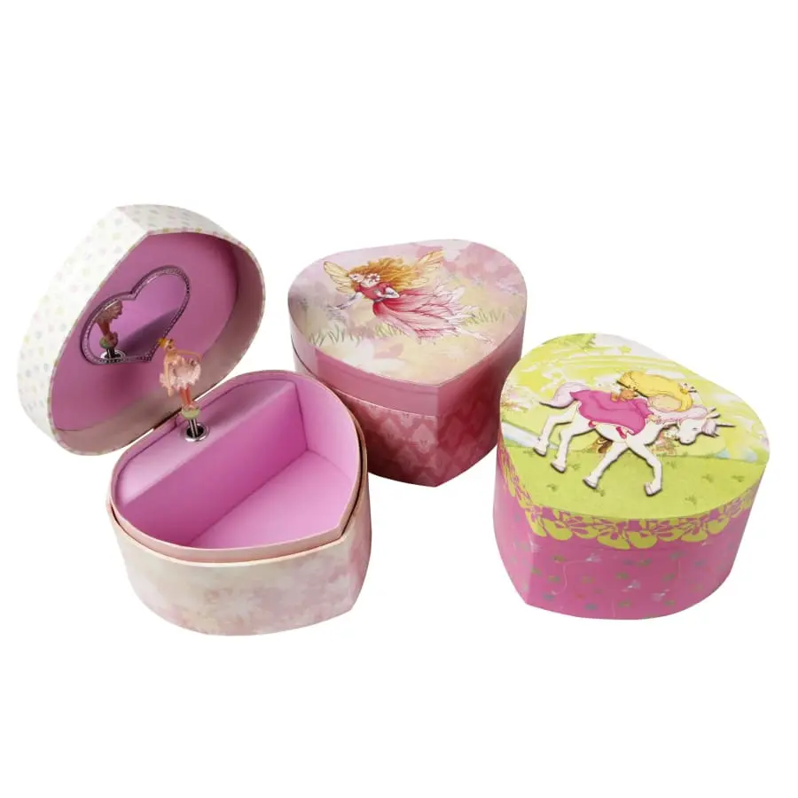Hjärtformat smyckeskrin med sammetslen insida och en uppdragbar, inbyggd speldosa. Lyft på locket så spelar den vacker musik, medan en ballerina dansar framför den lilla spegeln i locket. Sorteringen består av tre olika motiv. 3+
