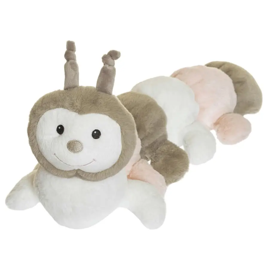 The cute centipede has a soft colour palette combining grey, pink and white. Nice to cuddle and also works as a cushion against the hard surfaces of the cot. The eyes, nose and mouth are embroidered and the antennae are soft.