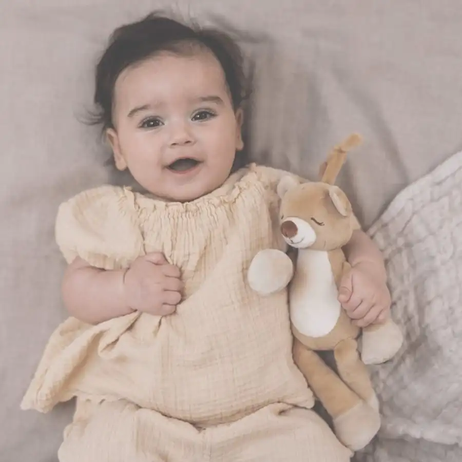 A cuddly, soft and sleep-inducing teddy bear music box. It can be attached to the edge of a cot or a pram to keep an eye on your little sleeper.