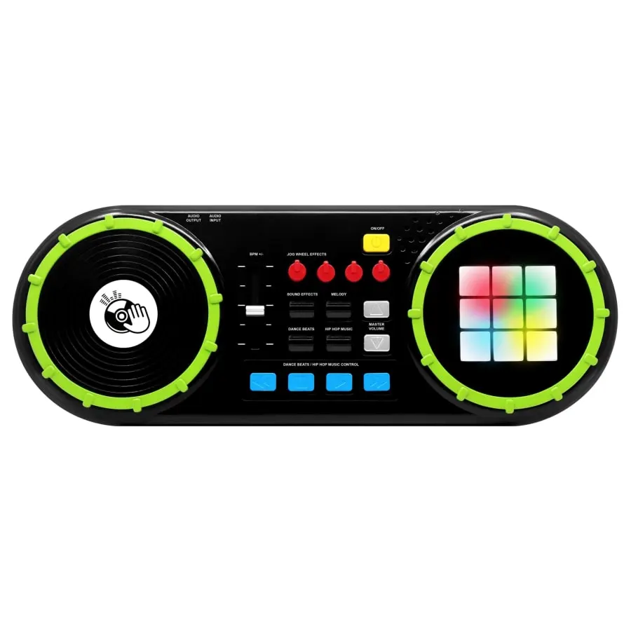 Der är din tur att vara DJ och mixa din musik. Glid, skratcha och och tryck på knapparna för att välja effekter och rytmer. Du kan också lyssna på din egen musik med mixern. Batterier 3 x AA ingår. Storlek: 18 x 47 x 5 cm. 4