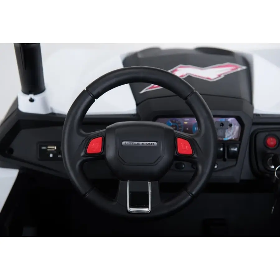 Barns elektrisk 4×4 strandloppa med fina detaljer. Rantakirpu har öppningsbara dörrar och fram- och bakljus. Mjukare, tystare EVA-plastdäck garanterar bra grepp, däcken har stötdämpare. Plats för två barn. Levereras med en fjärrkontroll, med vilken en vuxen kan styra bilen tills barnet lär sig att köra säkert. Strandloppan har ett säkerhetsbälte för att öka dess säkra användning.