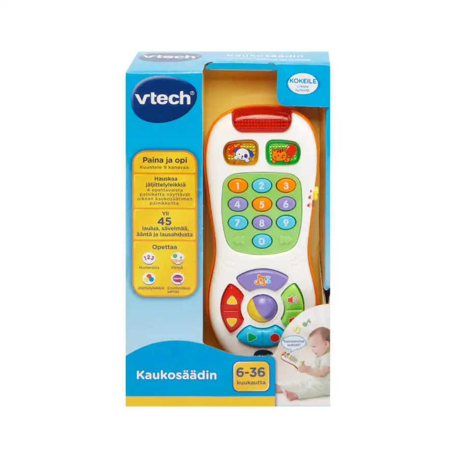 Your baby can be just like mum and dad with their very own remote control! The VTech Tiny Touch remote is suitable for tiny hands. With a flashing light at the top of the remote, lots of press buttons to help promote fine motor skills, the baby can have so much fun discovering channels. The ten number buttons introduce numbers and colours while the roller ball plays melodies and sing-along songs. The baby can even roll play recording and then playing their favourite channel, change the volume and change the channel by pressing the up and down arrows! Fun responses will play to give cause and effect. Includes 45+ songs, melodies, sound effects and funny phrases.
